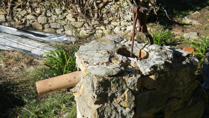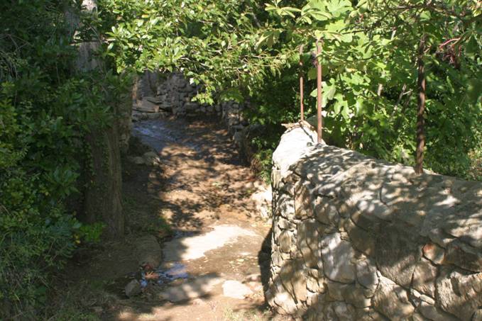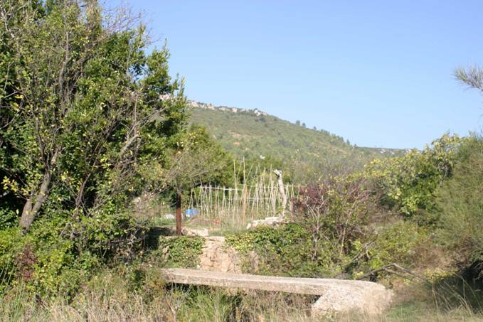 En allant vers la fontaine froide, on passe dans la zone des jardins potagers, au pied du castillou roumanissa (soit le champ de romarin). Ces jardins sont entourés de murs en pierre sèche et possèdent un puits avec pompe.