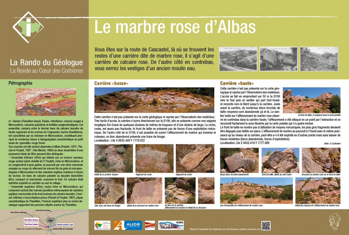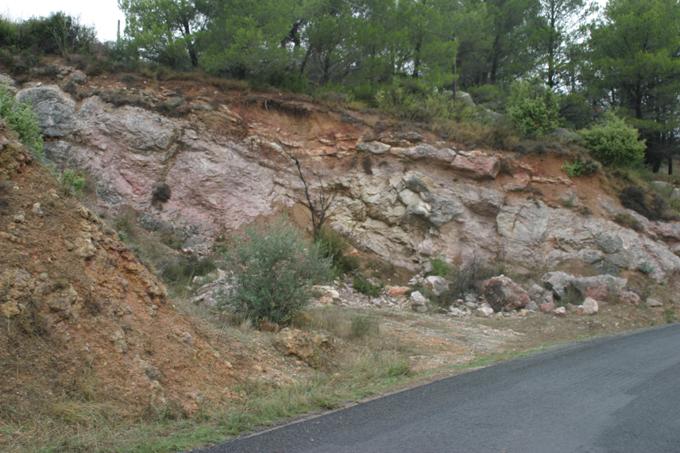 Il s’agit d’une carrière de calcaire rose avec deux sites d'exploitation. Il y a une carrière "basse" le long de la route et unne carrière "haute" un peu plus haut.