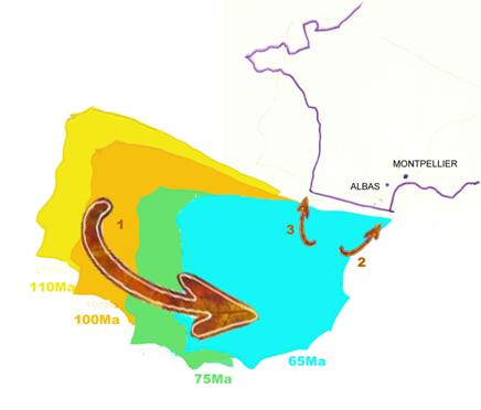 Au début du Tertiaire (-65 Ma), elle remonte vers le nord du fait du mouvement de l'Afrique, provoquant ainsi le plissement de la zone de coulissement, avec la formation des Pyrénées et des mouvements tectoniques jusqu’au nord de Montpellier. (Ce sont ces mouvements qui nous intéressent à Albas).