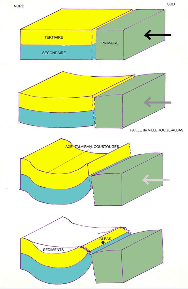 Un synclinal se forme sur l’axe TALAIRAN-COUSTOUGES et son flanc sud remonte le long de la faille dite de VILLEROUGE-ALBAS.